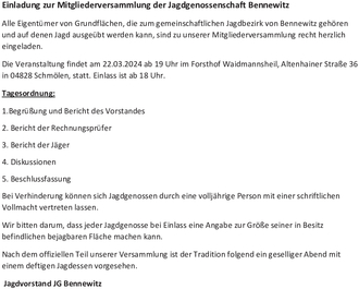 Alle Eigentümer von Grundflächen, die zum gemeinschaftlichen Jagdbezirk von Bennewitz gehören und auf denen Jagd ausgeübt werden kann, sind zu unserer Mitgliederversammlung recht herzlich eingeladen.