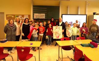 Dies war der Erlös aus dem Verkauf der Speisen und Getränke am Tage seiner Jubiläumsfeier. Die Klasse 4b bedankte sich gleich mit einem Mini-Weihnachtsprogramm bei ihm.