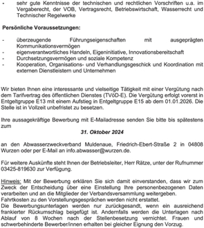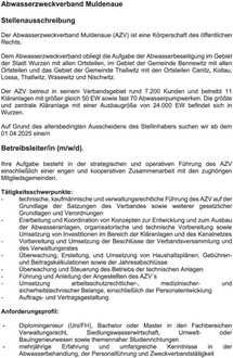 | - | mehrjährige Erfahrung und umfangreiche Kenntnisse in der Abwasserbehandlung, der Personalführung und Zweckverbandstätigkeit |