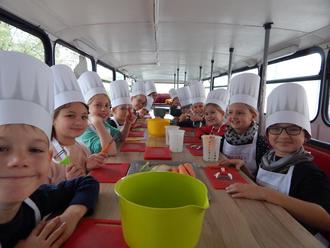 Am 24.10.2023 öffnete der Hausmeister sehr früh das große Hoftor – nicht für die Kinder, sondern für einen ganz besonderen Gast. Es fuhr nämlich der Kartoffelkochbus auf den Hof. Das ist ein umgebauter Bus, in dem man schälen, schnippeln, vermischen, backen und natürlich kosten darf. Doch bevor es los ging, gab es eine Schürze und eine Kochmütze für jeden Teilnehmer. An diesem Tag kochten die Kinder der 2. und 3. Klasse in Gruppen eingeteilt. Sie hatten viel Spaß, lernten neue Dinge und bekamen am Ende sogar Geschenke. Ein großes Dankeschön geht an den Koch.