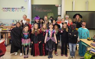 Der Tag beginnt wie immer in der Schule. Es gab viele coole Kostüme, z.b. Vampire, Skelett und noch andere Kostüme. Wir haben eine Halloween-Werkstatt durchgeführt. Dann gab es zum Frühstück Wiener-Spinnen, es war sehr lecker. Anschließend hat jeder einen Geist gebastelt. Wir haben auch Wettbewerbe gemacht, wer den coolsten Geist gebastelt hat und das coolste Kostüm anhatte. Das war ein cooler Tag.