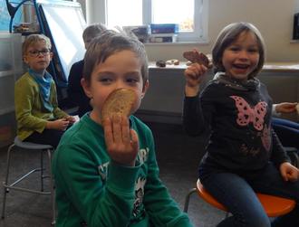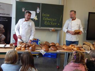 Nicht nur Ken Schwarze von der Bäckerei Schwarze besuchte uns diese Woche im Rahmen des schon zur Tradition gewordenen Brotprojektes „Brot macht Schule!“ der 3. Klassen. Diesmal brachte er auch Herrn Bernatzky mit, der die jährliche Brottestung kurzerhand in die Schule verlegte. Ein gespanntes Publikum konnte bei der Bewertung nicht nur zusehen, sondern sich auch von der hervorragenden Qualität selbst überzeugen. Herr Bernatzky führte zusammen mit allen Klassen die Brotprüfung durch. Es wurden Vollkornbrot und Körnerbrötchen probiert. Die Kinder durften dabei selbst sehen, fühlen, riechen und schmecken. Einige konnten sich bei der Gesprächsrunde schon sehr gut einbringen, für manche Kinder war es die erste Gelegenheit sich einmal intensiv mit Brot und Brötchen zu befassen und Unterschiede in Form, Farbe, Geschmack und Beschaffenheit bewusst wahrzunehmen. Am Ende waren sich alle Schülerinnen und Schüler einig, dass die Bäckerei