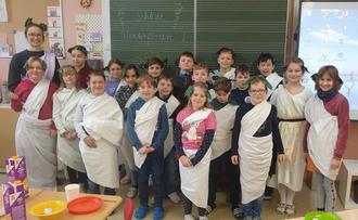 Klasse 4 beschäftigte sich in der Woche vor den Winterferien mit den Römischen Zahlen. Da die Römer noch viel mehr zu bieten hatten, machten wir gleich eine ganze Römerthemenwoche daraus. Ganz Standesgemäß empfingen die Kinder dann auch ihre Halbjahresinformationen und Bildungsempfehlungen mit Lorbeerkranz und Toga.