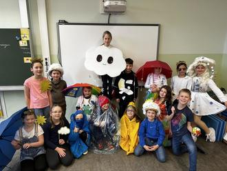 Zum Abschluss des 1. Halbjahres veranstalteten die Kinder der Klasse 3a und 3b eine lustige Modenschau. Wir waren sehr überrascht über die kreativen Einfälle der Teilnhemer. Es gab Wolkenkostüme, Wetterfrösche und vieles mehr. Jeder hatte sich auch einen lustigen Text zu seinem Kostüm überlegt. Sogar die passende Musik suchte Theo mit seinen Eltern dafür aus.