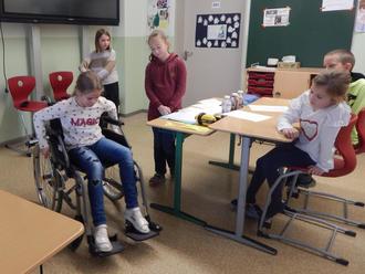 Am 04.03.2024 besuchte uns wieder einmal Christian Lissek vom Malteser Hilfsdienst Leipzig die Kinder unserer 3. Klassen und führte das Projekt „Wir bauen Brücken! Menschen mit Handicap im Alltag und in der Schule“ durch. Zum Einstieg in das neue Sachunterrichtsthema Sinne zeigte er, wie wichtig unsere Sinne im täglichen Leben sind. Mit verschiedenen Übungen erkundeten Die Kinder dieses Thema. Herr Lissek, der selbst auch Beeinträchtigungen hat, erzähle von seinem alltäglichem Leben. Gespannt hörten alle zu. Zu den schwierigsten Übungen gehörte auch das eigene Fahren mit einem Rollstuhl.