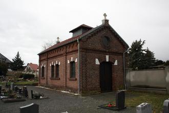 Die Trauerhalle / Leichenhalle ist ein eingeschossiger Massivbau mit Satteldach. Der teilweise aus Sandstein gemauerte, schön gegliederte Ziegelsteinbau steht auf einem Bruchsteinsockel. Beide Giebel ziert ein Kreuz. Die Halle verfügt über 26 Sitzplätze.