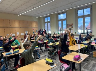 Kurz vor den Osterferien wurde es für die Kinder der 3a nochmal spannend, denn die erste Lesenacht fand statt. Beim Titel des Buches „In der Schule eingesperrt“, war schnell klar, das ist kein normales Buch. Das erste Kapitel endete mit einem Rätsel, ohne dessen Lösung man nicht wusste, wo weitergelesen werden muss." Mit dem gefundenen Zahlencode ließ sich ein Koffer öffnen. Nachdem die im Koffer versteckten Buchstaben in der richtigen Reihenfolge an der Tafel standen, riefen alle laut im Chor „Eine Lesenacht“ und die große Aufregung begann. Übernachten wir wirklich in der Schule? Am 5. April war es dann endlich soweit und 17 Uhr trafen sich alle im Flachbau, um das Schlaflager für die Nacht aufzubauen. Wir stärkten uns für die folgenden Rätsel mit leckeren Pizzen. Es war schön zu sehen, wie die Kinder an die Lösung herangingen und sich jeder versuchte, einzubringen. Danach ging es auf Schatzsuche durch das Schulhaus. Die Freude über die Schatzkiste mit Naschereien, Leuchtstäben und Seifenblasen war groß. Die Leuchtstäbe konnten dann bei gemeinsamen Spielen auf dem Schulhof in der Dunkelheit genutzt werden. Alle Erwachsenen erfreuten sich an dem tollen Miteinander der Kinder. Bevor es ins Bett ging, wurde noch ein Kapitel gemeinsam gelesen. Wenn es nach den Kindern gegangen wäre, hätte es weitergehen sollen, aber man soll aufhören, wenn es am schönsten ist. Danach gab es noch eine wilde Kissen-schlacht, bevor sich wirklich alle in die Betten kuschelten und noch ein wenig über den Tag geredet wurde. Die einstimmige Meinung: Wir wiederholen das in Klasse 4!