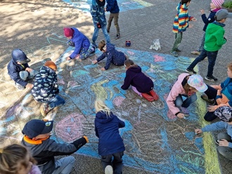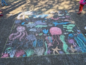 Unter dem Motto „Wir entdecken die Natur im Wasser-Unterwasserwelt“ malten die Kinder der ersten bis vierten Klasse mit Straßenmalkreide am Kinderweltmaltag (05.05.2023) auf unserem Schulhof.