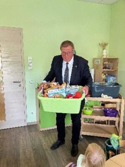 Anlässlich des Kindertages am 01.06.2025 wollten wir unseren Kindern einen unvergesslichen Start in die neue Woche bieten. Bereits Tage vorher schmückten bunte Wimpelketten unser Kindergartengelände. In vielen Gruppen startete der Tag mit einem gemeinsamen Büfett. Anschließend überraschte uns Herr Laqua mit einem Geschenkekörbchen. Darin befanden sich verschiedene Präsente für die Gruppen. Da strahlten alle Kinderaugen.