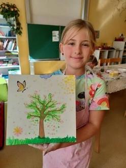 Kreativität zeigte jedes Kind beim Gestalten einer kleinen Leinwand mit Tupfertechnik. Jeder fand sein Motiv, ob ein Fußballer, ein bunter Baum oder Schmetterlinge entstanden, alle Leinwände sahen fantastisch aus. Der Besuch beim Bundessortenamt in Wurzen war sehr lehrreich und wir waren tolle, fleißige Obstpflücker.