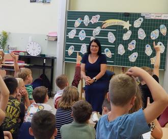 Am 12. August 2025, dem zweiten Schultag, luden die 4. Klassen Frau Lehmann zu einem Interview ein. Neben ganz persönlichen Fragen nach Alter, Kindern, Hobbys, Wohnort, … interessierten sich unsere Viertklässler auch, wie sie die ersten Tage als Schulleiterin in Bennewitz fand, wie viele Jahre sie schon Schulleiterin ist und was denn ihre Lieblingsfächer sind. Frau Lehmann beantwortete jede der Fragen sehr ausführlich. Am Ende hatte sie auch noch Fragen an die Kinder: Was gefällt euch an eurer Schule? Und: Was wünscht ihr euch?