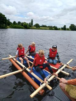 Die zweite Ferienwoche startete mit einem Frühstückspicknick auf dem Bennewitzer Spielplatz. Am Dienstag wurde es kreativ und wir gestalteten mit Gefriertüten bunte Blumenbilder. Unser Highlight der Woche war der Besuch im Bootshaus in Schmölen. Dort konnten wir selber ein Floß bauen und sind damit auf die Mulde gegangen. Das Bauen eines Floßes in der Gruppe war eine tolle, knifflige und sehr kreative Aufgabe. Die Kinder mussten im Team arbeiten und der Lohn sowie das Spannendste am Ende war, ob das Floss im Wasser nicht unter Wasser ging. Alle Gruppen schafften diese sehr anspruchsvolle Aufgabe mit Bravour. Toll. Ab und zu wurde jeder doch ein Mitglied unserer Crew nass und hat sich eine kleine Erfrischung in der Mulde gegönnt. Ahoi Piraten – unsere eigenen Floße haben alle die rasante Fahrt geschafft.