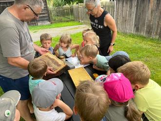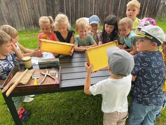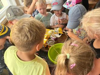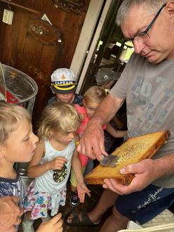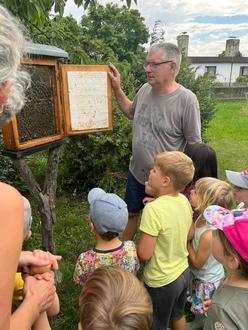 Am 17. August machte sich, bei herrlichstem Sommerwetter, die Gruppe der Buntspechte auf nach Schmölen zum Imker. Dieser Ausflug war der Höhepunkt unseres Bienen-Projektes. Und so erwartete Herr Piotrowski viele Kinder, welche die Welt der Bienen noch genauer erforschen wollten.