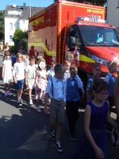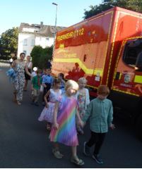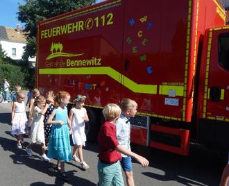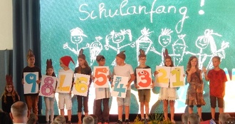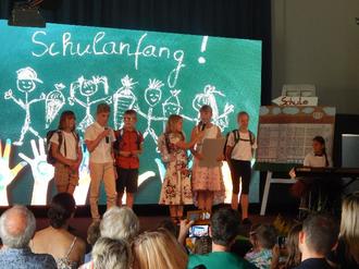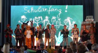 Am 19. August war es wieder so weit - in der Turnhalle wurde kein Sport getrieben, sondern es fanden die Feiern für die neuen Schulanfänger statt. Dafür verwandelte sich die Sportstätte wieder mit Hilfe vieler fleißiger Hände: eine große Bühne wurde aufgebaut, viele Stühle hineingestellt, alles festlich geschmückt… Pünktlich saßen die ABC-Schützen und ihre Gäste aufgeregt auf ihren Plätzen. Zuerst erhielten sie durch unseren selbst gedrehten Film einen Einblick in unser Schulleben. Dann führten die Kinder der neuen 4. Klassen ein Stück auf, bei dem die Hasen und Zwerge die Buchstaben und Zahlen einfach wegnahmen. Anschließend standen festlich geschmückte Feuerwehrautos für die Fahrt zur Grundschule bereit. Dort angekommen erhielt jeder Schulanfänger seine langersehnte Schultüte.