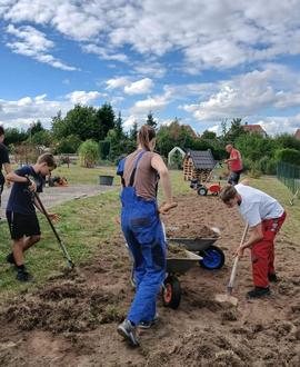 Am 29.08.25 startete das 3-tägige Folgeprojekt unserer „BRUMMenade Eschenring/Ahornring 2024““. Thomas Arnold, Vorsitzender der Sparte Am Schulweg gab den Anstoß für weitere insektenfreundliche Oasen in Bennewitz und somit folgten 12 Kinder und Jugendliche seinem Aufruf und machten sich auf, um unter Anleitung von Spartenchef Thomas und Marco Stregemann (LPV Leipzig Grün) gemeinsam Materialien für Insektenhotels und Totoholzhaufen zu sammeln, Trockensteinmauern zu bauen, Böden für weitere Blühwiesen aufzubereiten und einzusäen, Insektenbehausungen zu bestücken und Totoholzhaufen anzurichten. Dazu gab es gesunde Mahlzeiten mit frischem Gemüse im Jugend- und Freizeittreff WERNER MOSER – an der Stelle ein großes Dankeschön für die leckeren Tomaten dem Dahlienkönig der Sparte … und Torsten Fröhlich vom „Wandernden Zuhause“ e.V. lud uns zum nächtlichen WALDHORCHEN in den Planitz, bei dem wir nicht nur unsere Achtsamkeit schulten, sondern auch die Gelegenheit hatten, uns unserer Dunkel-Angst zu stellen. Und um Mitternacht ein herzerwärmendes Filmchen, nämlich „Der wilde Roboter“; welches uns selig in die Falle im Jugendhaus krabbeln ließ.. Rund um ein tolles, schaffensreiches Wochenende mit tollen Ergebnissen. HERZLICHEN DANK Thomas, Du bist absolut engagiert und zuverlässig – wir kommen gern nächstes Jahr wieder! Und HERZLICHEN DANK Marco und Torsten, dass Ihr Euch das Wochenende freigehalten und uns bei unserem Vorhaben unterstützt habt! Die Insektenfreundliche Parzelle kann perspektivisch von den Bennewitzer Grundschülern als „Lehr-Schau-Garten“ genutzt werden und vielleicht verirrt sich die Theater Gruppe des Jugend- und Freizeittreffs ja auch dahin - im Freien bei schönstem Sonnenschein lässt sich nämlich einfach besser proben!