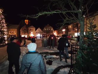 Mit dem Nachtwächter auf dem verschneiten Marktplatz.