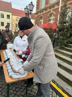 Bürgermeister Marco Babenz beim Stollenanschnitt. Der Feststollen wurde von der Bäckerei Bubner spendiert.