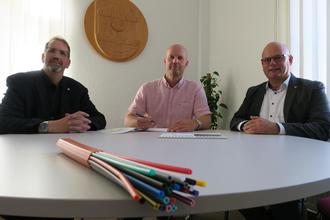 Gaben per Unterschrift den symbolischen Startschuss für den Glasfaser-Ausbau in Calau (v. links): Jörg Rothbarth (Manager Kommunale Kooperation), der Calauer Bürgermeister Marco Babenz und René Becker (Projektmanager von Deutsche Glasfaser).