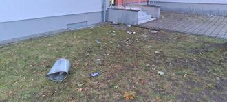 Ein zerstörter Müllbehälter am Eingang der Stadtbibliothek.
