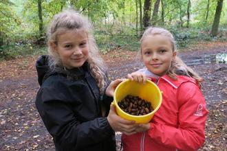 Stolz präsentieren Karla (links) und Anabell die von ihnen gesammelten Eicheln. Diese dienen dem Eichelhäher als Winterfutter und sorgen zugleich dafür, dass im Stadtwald in Zukunft neue Eichen wachsen.