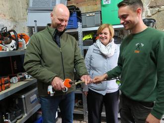 Mitmachen erlaubt: Tim Prowatschke (rechts) zeigt Wirtschaftsförderin Franziska Wölkerling und Bürgermeister Marco Babenz wie eine akkubetriebene Astschere funktioniert.