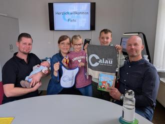 Die Familie erhielt von Bürgermeister Marco Babenz als Geschenk im Rahmen der "Calauer Baby-Aktion" ein besticktes Babylätzchen mit dem Logo der Stadt Calau. Dazu gab es einen Stoffrucksack mit allerhand nützlichen Informationen für junge Eltern, die freundlicherweise von der Bundeszentrale für gesundheitliche Aufklärung (BZGA) zur Verfügung gestellt wurden. Ein paar selbst gehäkelte Söckchen sowie ein exklusiver Untersetzer fürs Babyfläschchen rundeten das Willkommenspaket ab.