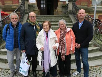 Bürgermeister Marco Babenz (rechts) und Amtsvorgänger Werner Suchner (links) konnten am 1. Oktober mit Lars Anwandter, dessen Mutter Britta Eleonore (Bildmitte) und Cousine Lucia Nachfahren von Carl Anwandter in Calau begrüßen.