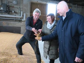 Helmut Richter zeigt der Wirtschaftsförderin und dem Bürgermeister, dass der Mais schon ziemlich trocken ist. Bald kann daraus Futter für die Milchkühe werden.