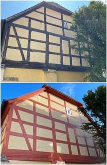 Doch warum sind die neuen Balken des Fachwerks nun rostrot statt dunkelbraun? Auch darauf weiß Projektleiter Heiko Schneider eine Antwort und verweist auf den Denkmalschutz: „Die Untersuchungen der Denkmalschutzbehörde ergaben, dass der ursprüngliche Gebäudeanstrich aus der Bauzeit Ende des 18. Jahrhunderts einen Ockerton aufwies. Die Färbung wurde durch den Einsatz verschiedener Tonmehle erzielt, wobei Quark als Bindemittel Verwendung fand. Der hohe Eisengehalt der regionalen Erden führte dabei zu der typischen Ockerfärbung.“ Die frühesten Bilddokumente des historischen Gebäudes aus der Zeit um 1900 zeigen bereits dunkel gefasste Balken. „Nach Recherchen der Denkmalschutzbehörde wurden die Balken schonmal erneuert und der Anstrich mit Kohlenstaub vermischt, was ebenfalls als regionaltypisch gilt“, so Heiko Schneider weiter. Generell hebt er die hervorragende Zusammenarbeit zwischen Denkmalschutzbehörde, Bauamt und den bauausführenden Betrieben vor. Nur dadurch sei es gelungen, die Sanierung ohne nennenswerte Probleme und im vorgesehen Zeitfenster durchzuführen.