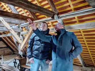 Im Dachstuhl des sanierten Heimatmuseums: Projektleiter Heiko Schneider (re.) und Bauamtsleiter Christian Spiller inspizieren die neue Dachlattung.