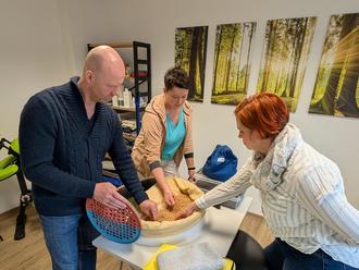 Kirschkerne eignen sich perfekt, um die Finger- und Handmuskulatur zu stärken. Davon überzeugten sich Bürgermeister und Wirtschaftsförderin in der Ergotherapiepraxis von Cornelia Kühnel.
