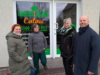 Vor dem Geschäft in der Karl-Marx-Straße 101 (von links): Wirtschaftsförderin Franziska Wölkerling, Anja Depold, Birgit Lehmann und der Calauer Bürgermeister Marco Babenz.