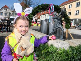 Eine Assistentin des Osterhasen sorgt für den "letzten Schliff" am dekorierten Osterbrunnen. Denn auch der Schusterjunge hat eine kleine Osterüberraschung verdient.