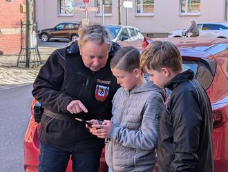 Andrea Noack, Mitarbeiter des Ordnungsamtes, zeigt Emil Giedow (Mitte) und Lucas Jerome Weise wie ein "Knöllchen" ausgedruckt wird.