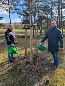 Am Friedhof in Schrakau nutzten Ortsvorsteher Heiko Maaß und Bürgermeister Marco Babenz die Gelegenheit, um einen jungen Baum mit einer kleinen Erfrischung zu versorgen.