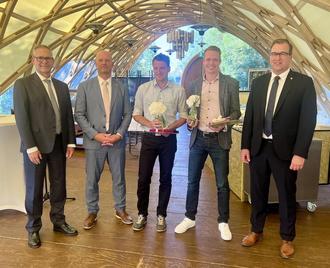Auszeichnung der Calauer Ehrenamtler (von links): Marcus Starick, Vorstandsvorsitzender der Sparkasse Niederlausitz, Bürgermeister Marco Babenz, der die Laudatio hielt, Patrick Wölfel, Colin Schneider und Alexander Erbert, Beigeordneter des Landkreises.