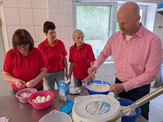 In der A+E Kantine griff der Bürgermeister bei seinem Besuch direkt selbst zum Schneebesen und half beim Rühren einer Quark-Nachspeise. Chefin Anne-Kathrin Barberka (2. von links) war zufrieden mit dessen Arbeit.