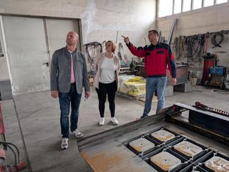 Andreas Liebegall (rechts), Werkleiter bei Schreyer Schornsteinbau, führte den Bürgermeister und die Wirtschaftsförderin durch die verschiedenen Produktionsbereiche des Calauer Werkes.