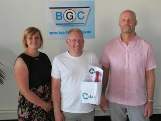 BGC-Geschäftsführer Philippe Gessner (Mitte) bekam anlässlich des Firmenjubiläums ein Präsent vom Calauer Bürgermeister und der Wirtschaftsförderin.