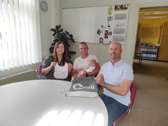Die Familie erhielt von Bürgermeister Marco Babenz als Geschenk im Rahmen der "Calauer Baby-Aktion" ein besticktes Babylätzchen mit dem Logo der Stadt Calau. Dazu gab es einen Stoffrucksack mit allerhand nützlichen Informationen für junge Eltern, die freundlicherweise von der Bundeszentrale für gesundheitliche Aufklärung (BZGA) zur Verfügung gestellt wurden. Ein paar selbst gehäkelte Söckchen sowie ein exklusiver Untersetzer fürs Babyfläschchen rundeten das Willkommenspaket ab.