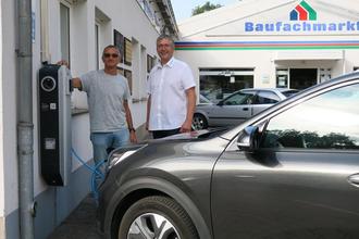ELG-Vorstand Christian Worreschk (links) und Mitarbeiter Hans-Joachim Pohle testen die Funktion des neuen Ladepunktes.