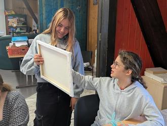 Josy (11) zeigt Maila (12) ein Kunstwerk, welches sie in der Ferienwoche im Calauer Jugendclub angefertigt hat.