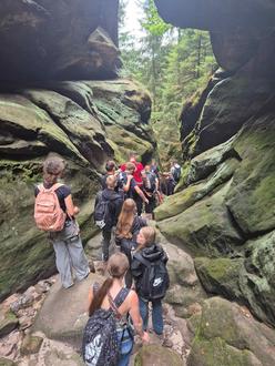 +++ Die Klasse 9 a nutze das herrliche spätsommerliche Wetter für eine Klassenfahrt nach Bad Schandau. Auf dem Programm standen zwei große sportliche Aktionen. Zum einen unternahmen die Mädchen und Jungen eine Schlauchboottour bei der voller körperliche Einsatz gefragt war, um in der Spur zu bleiben. Zum anderen hieß es bei der Bewältigung der „Häntschelstiege“ Baucheinziehen und Augen zu. Der Klettersteig forderte alle ganz schön durch seine zum Teil sehr engen Spalten, durch die man hindurch musste, aber auch durch seine in schwindelerregender Höhe liegenden Tritte. Talabwärts ging es dann über die ´“Wilde Hölle“. Am Ende des Tages hatten es alle geschafft und waren sehr stolz auf sich selbst. +++