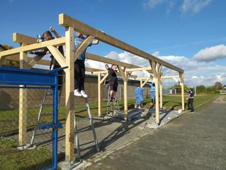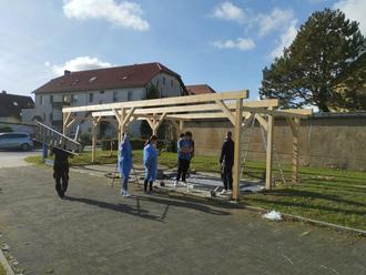 +++ Ende Oktober war es endlich soweit und das Gewinnerprojekt aus dem vorigen Schuljahr wurde in die Tat umgesetzt – eine Überdachung für die Mopeds hatte gewonnen. Vor Kurzem wurde nun das Grundgerüst mit Hilfe der Firma Dach- und Holzbau Schadel GmbH gebaut. Nun lag es an den Schülern dieses zu gestalten und zu streichen. Dank des schönen Wetters waren alle sehr motiviert und Frau Pirl passte auf, dass nichts schiefging. Mit Leiter, Pinsel, Farbe und Kittel wurde sich also an die Arbeit gemacht. Das Ergebnis ist überzeugend geworden und sieht gut aus. Später setzte dann die Firma Dach- und Holzbau Schadel GmbH, dem Ganzen auch noch das Dach auf. Die Fertigstellung hat uns wirkich eine große Freude bereitet.+++