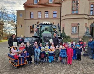 An einen schönen Montagmorgen wurden die Kinder und Erzieher durch ein lautes Motorengeräusch aus der Kita gelockt. Als alle aus der Tür kamen wurden die Augen der Kinder immer größer. Da stand Rick Langenbach von der Agrargenossenschaft Gaunitz mit dem Traktor auf dem Schulhof. Alle Kinder waren ganz aufgeregt und konnten einmal Probe sitzen und über den ganzen Hof schauen. Auch Bücher, mit vielen interessanten Seiten über die Landwirtschaft in allen Bundesländern, gab es für jede Gruppe. Danke für das aufregende Erlebnis.