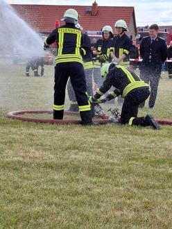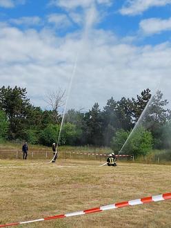 Es folgte der Spaßwettbewerb, bei dem es darum ging, einen Verkehrskegel mithilfe von Wasserdruck und Teamwork möglichst weit über den Rasen zu befördern. Hier konnte die Ortswehr Klingenhain/Schirmenitz/Außig erneut punkten und den ersten Platz erringen. Es folgten in der weiteren Platzierung die Kameradinnen und Kameraden der Wehren aus Olganitz, Sörnewitz, Treptitz, Bucha/Zeuckritz und Cavertitz.