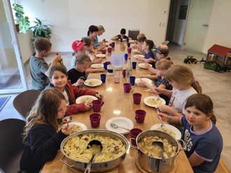 Die 2. Klasse lässt sich das Mittagessen im Landwirtschaftsbetrieb Hühnlein schmecken.