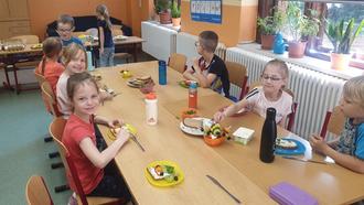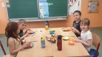 Mit tatkräftiger Unterstützung von Frau Jüttner wuschen und schnitten die Erstklässler das Obst und Gemüse. Danach gestalteten sie lustige Brotgesichter und stellten vielfältige Obst- und Gemüsespieße her. Einer half dem anderen. So waren die Kinder mit Freude bei der Sache und ließen sich am Ende ihr kreatives Frühstück schmecken. Für jeden war etwas Leckeres dabei und es konnte auch einmal etwas Neues gekostet werden.