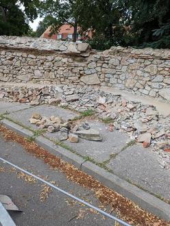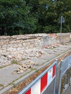 Die nunmehr laufenden Arbeiten erfolgen in enger Abstimmung mit der Denkmalschutzbehörde und dem Landesamt für Denkmalpflege. So wurde zur gemeinsamen Bauberatung am 14.07.2023 die Musterfläche sowie das zur Verwendung kommende neue Natursteinmaterial bemustert und freigegeben. Festlegungen zur Verfahrensweise in dem Bereich, in welchem - nach Freilegung - Ziegelmauerwerk vorgefunden wurde, getroffen. Dem entsprechend ist dieser Teil der Mauer, da kein Natursteinmaterial mehr vorhanden, mit Trasskalkmörtel flächig neu verputzt werden.