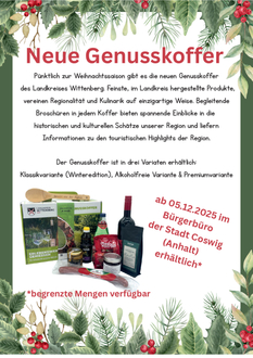 Pünktlich zur Weihnachtssaison gibt es die neuen Genusskoffer des Landkreises Wittenberg. Feinste, im Landkreis hergestellte Produkte, vereinen Regionalität und Kulinarik auf einzigartige Weise. Begleitende Broschüren in jedem Koffer bieten spannende Einblicke in die historischen und kulturellen Schätze unserer Region und liefern Informationen zu den touristischen Highlights der Region. Der Genusskoffer ist in drei Varianten erhältlich: Klassikvariante (Winteredition), Alkoholfreie Variante & Premiumvariante *begrenzte Mengen verfügbar